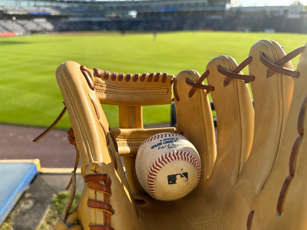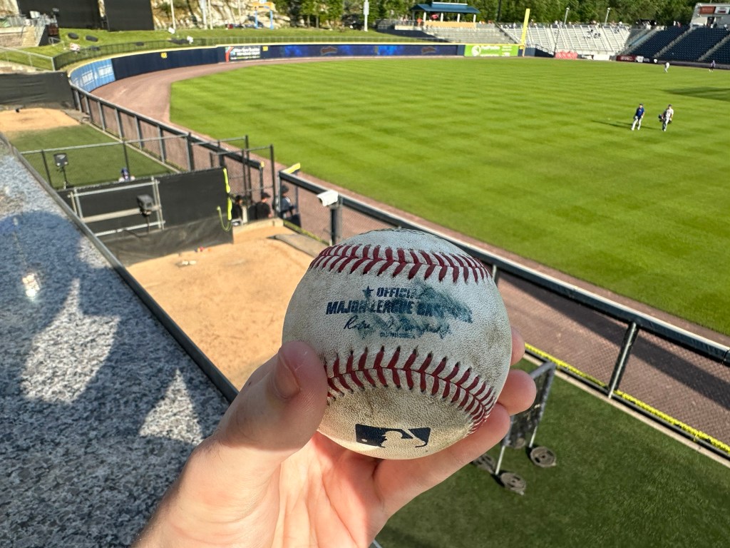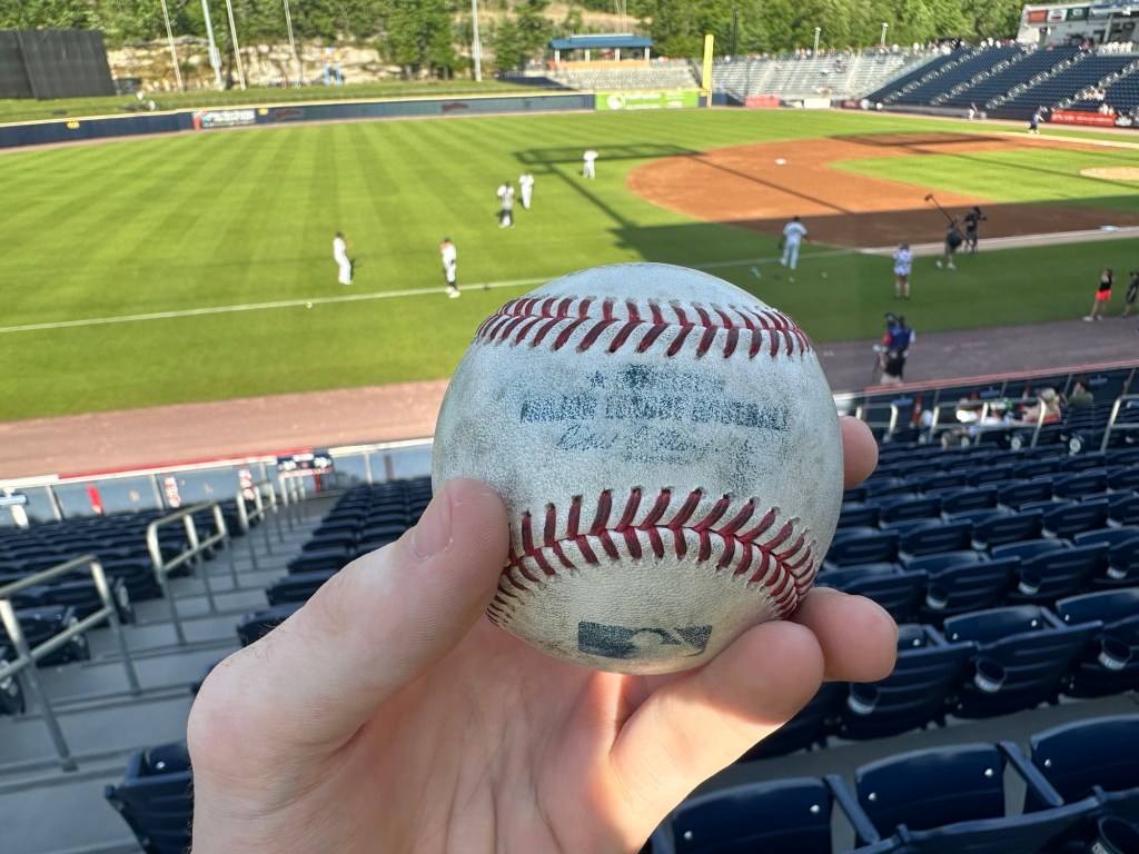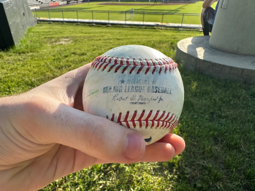 By that point my parents had made their way over to the bar in right field to chat with our friends who work there. So, I figured I’d join them and stay out there for a bit. Found a nice shady rock to sit on because it was 90+ degrees out and hardly any escape from it. Right as I sat down though, my favorite friendly usher came over and walked right in front of me. Why? He had this behind his back and placed it in my glove in the most casual way possible: