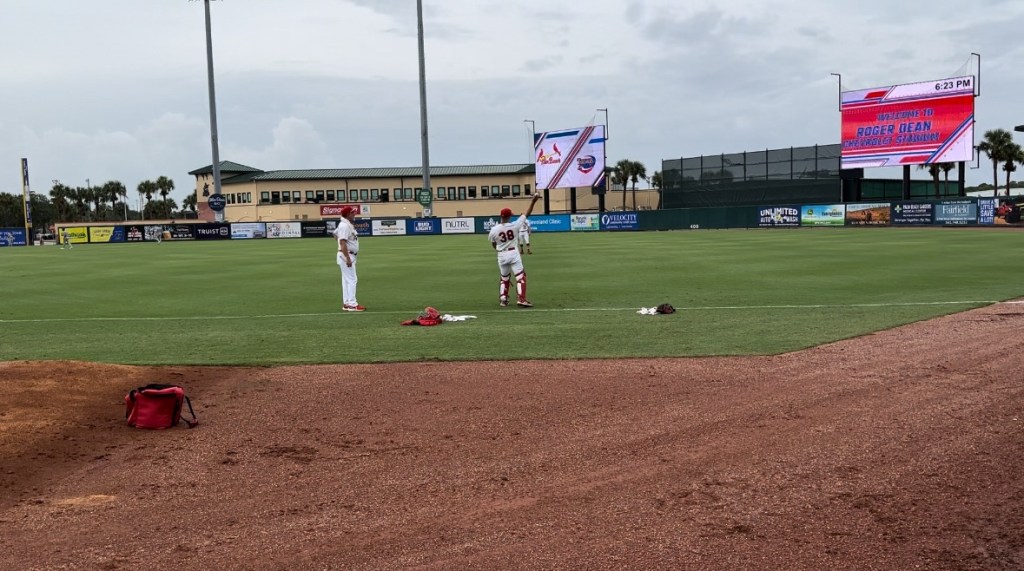 I didn’t sense anything from the Cardinals bullpen, so I hurried over to the Threshers side. Just in time to catch starter Mavis Graves finish his bullpen session. Once he was done, the ball stayed with catcher Jared Thomas, who then tossed it to me.
