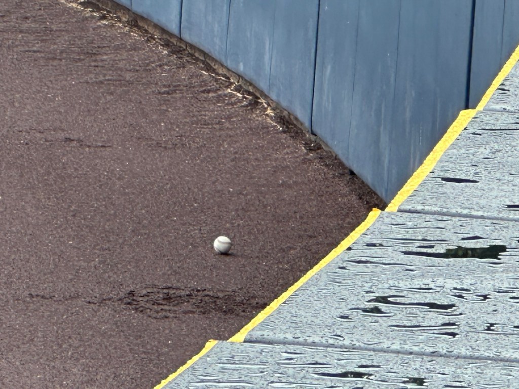 Despite that, there WAS a ball on the field. One singular ball. Just sitting there on the warning track in center field, waiting to be rescued.